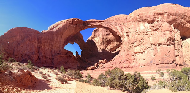 On the first day we drove down White Rim road to a place called Musselman Arch, and then rode about 11 miles to our campsite at Airport Tower. When we rode out the next day we rode back to this sign (about 18 miles) and then we went down Potash Road for a while, but I'm not sure how far. Below is Musselman Arch. It is a natural bridge about 4 feet wide.